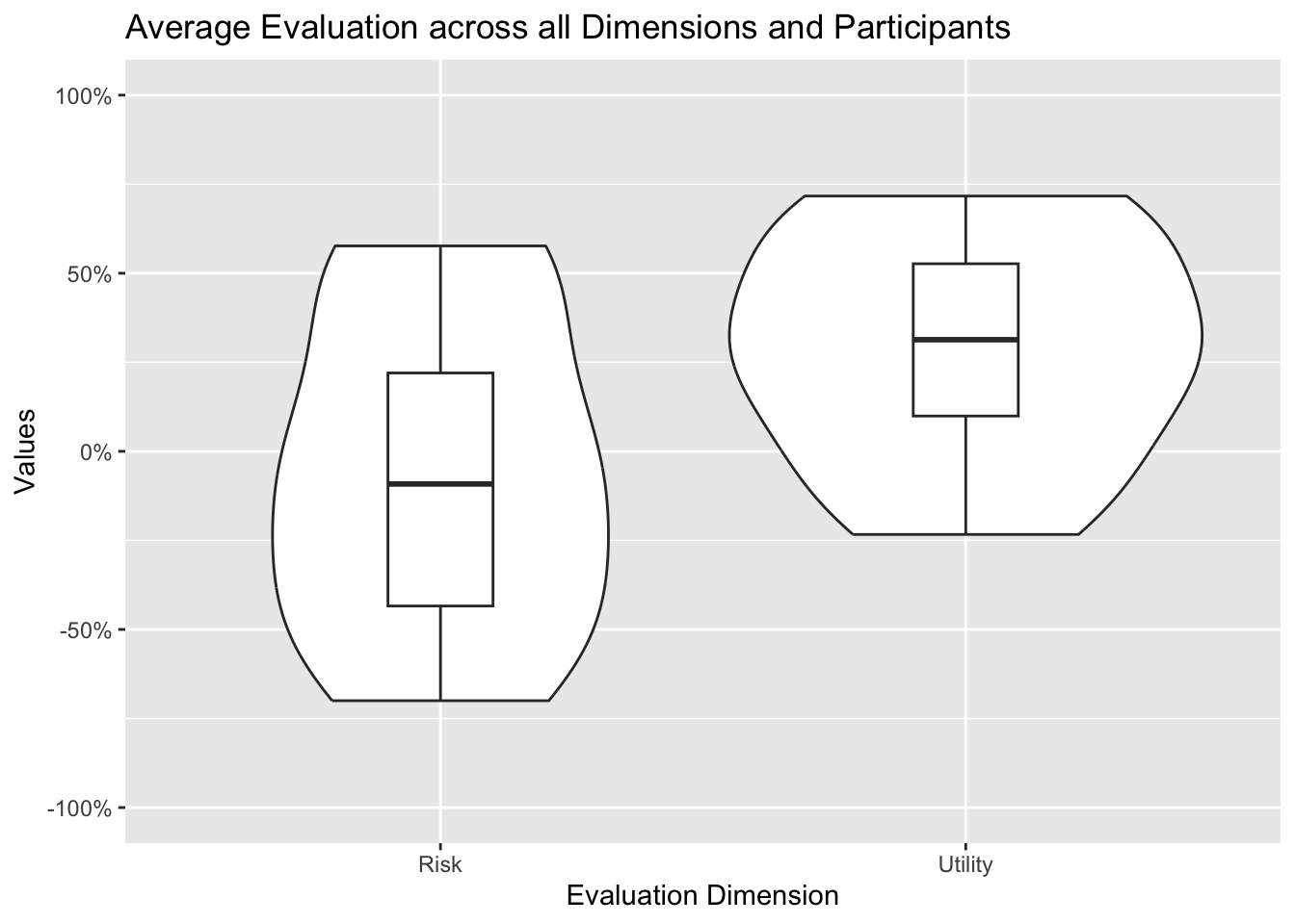 dataByDimensionQuestion <- evaluationsLong %>% dplyr::group_by( question, dimension ) %>% dplyr::summarise( mean =mean(value, na.rm =TRUE),sd =sd(value, na.rm =TRUE),.groups ='drop')overallDimension <-ggplot(dataByDimensionQuestion,aes(x =factor(dimension, levels =c("risk", "utility", y = mean)), y= mean)) +geom_violin() +geom_boxplot(width=0.2,position =position_dodge(width =0.75)) +scale_y_continuous(labels =percent_format(),limits=c( -1, +1 )) +scale_x_discrete(labels =c("risk"="Risk","utility"="Utility")) +labs(x ="Evaluation Dimension",y ="Values",title ="Average Evaluation across all Dimensions and Participants")overallDimension