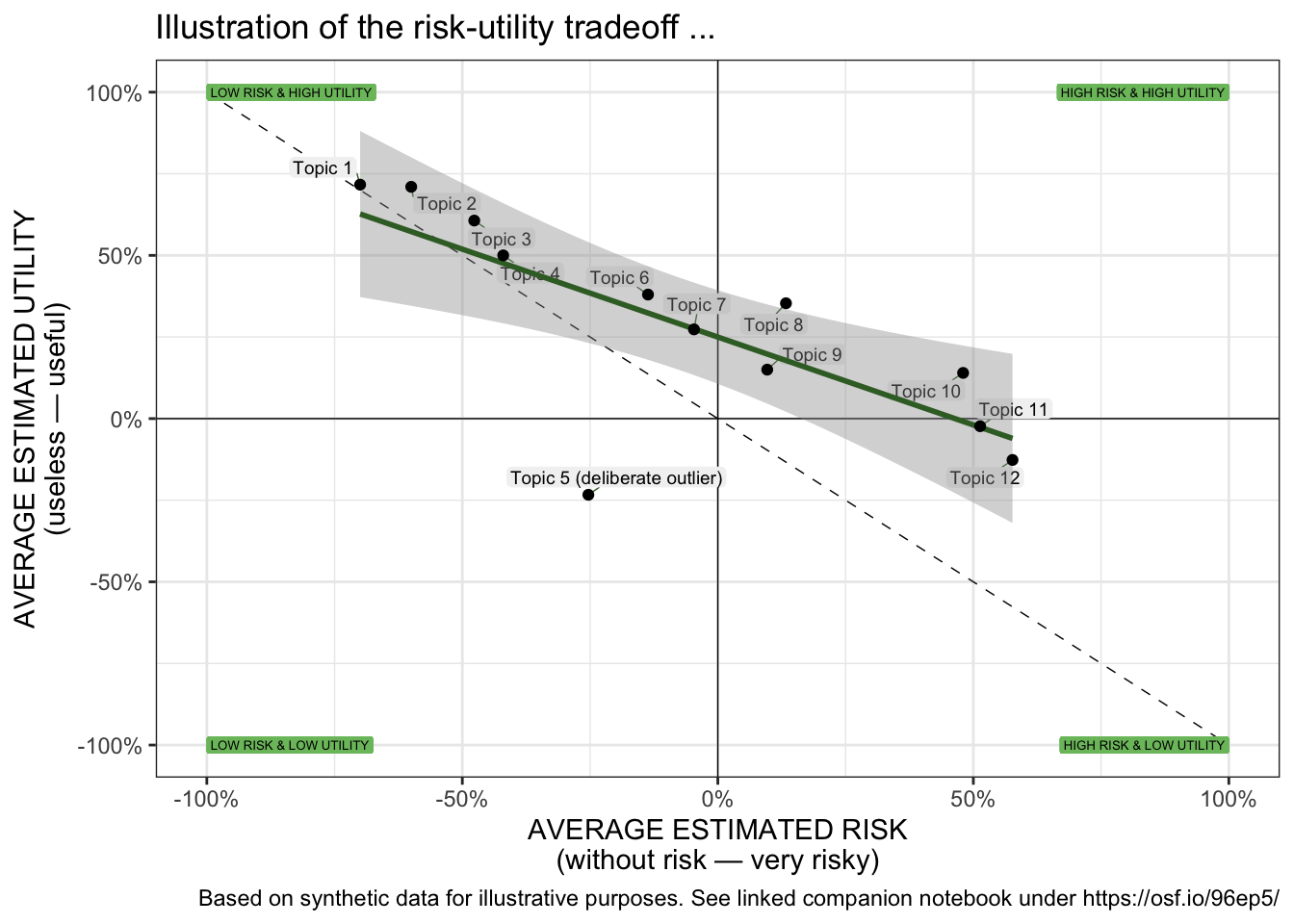 scatterPlot <- evaluationByTopic %>%ggplot( aes( x = risk_mean,y = utility_mean,label = shortlabel)) +coord_cartesian(clip ="on") +geom_vline(xintercept =0, size =0.25, color="black", linetype=1) +geom_hline(yintercept =0, size =0.25, color="black", linetype=1) +# diagonal line indicating where both dimensions are congruent annotate("segment",x =-1, y =+1,xend =+1, yend =-1,colour ="black",linewidth =0.25,linetype =2) +# Annotate the quadrantsgeom_label(aes(x =-1, y =-1, label ="LOW RISK & LOW UTILITY"),vjust ="middle", hjust ="inward",size =1.75,label.size =NA, color="black", fill ="#7CBF6C") +geom_label(aes(x =-1, y =+1, label ="LOW RISK & HIGH UTILITY"),vjust ="middle", hjust ="inward",size =1.75,label.size =NA, color="black", fill ="#7CBF6C") +geom_label(aes(x =+1, y =-1, label ="HIGH RISK & LOW UTILITY"),vjust ="middle", hjust ="inward",size =1.75,label.size =NA, color="black", fill ="#7CBF6C") +geom_label(aes(x =+1, y =+1, label ="HIGH RISK & HIGH UTILITY"),vjust ="middle", hjust ="inward",size =1.75,label.size =NA, color="black", fill ="#7CBF6C") +# add the labels...geom_label_repel(max.time =3,color ="black",fill ="gray95",force_pull =0,max.overlaps =Inf,ylim =c(-Inf, Inf),xlim =c(-Inf, Inf),segment.color ="#3A6B2E",segment.size =0.25,min.segment.length =0,size =2.5,label.size =NA,label.padding =0.105,box.padding =0.125 ) +geom_smooth(method ="lm", se =TRUE, color="#3A6B2E") +geom_point() +# geom for the data pointslabs( title ="Illustration of the risk-utility tradeoff ...",caption ="Based on synthetic data for illustrative purposes. See linked companion notebook under https://osf.io/96ep5/",x ="AVERAGE ESTIMATED RISK\n(without risk — very risky)",y ="AVERAGE ESTIMATED UTILITY\n(useless — useful)") +scale_x_continuous(labels =percent_format(), limits=c( -1, +1 )) +scale_y_continuous(labels =percent_format(), limits=c( -1, +1 )) +theme_bw()scatterPlotggsave("simulatedriskutility.pdf",plot = scatterPlot,width =8, height =6,units ="in")