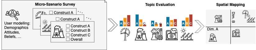 Figure 1: The micro-scenario approach involves consolidating evaluations of diverse topics in a single survey. These evaluations are treated as topic assessments and spatially mapped to analyze the interrelationships among them.