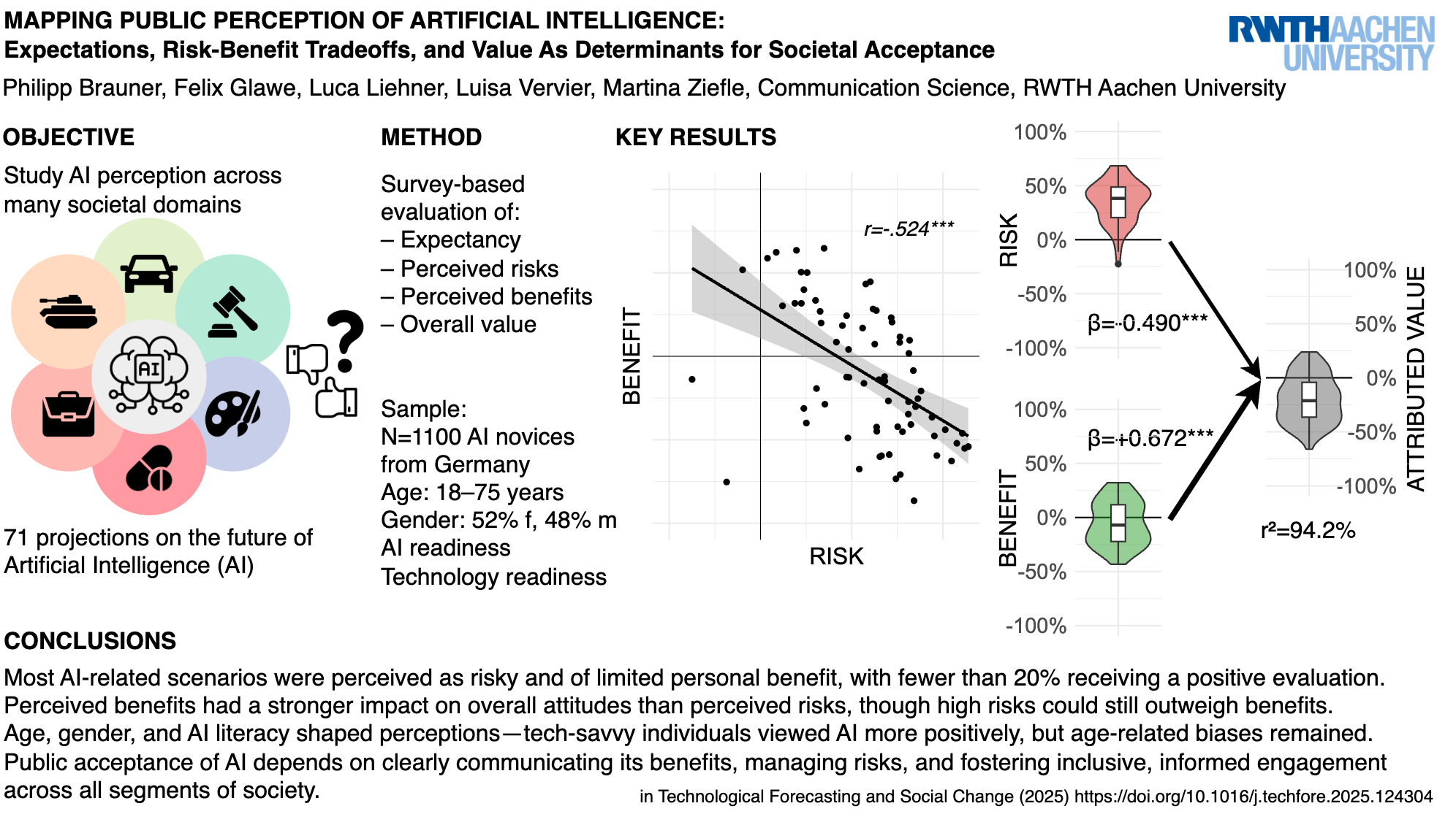 Figure 2 shows a graphical abstract from a refereed article that applied the micro scenario approach in the context of public risk–benefit perception of Artificial Intelligence. On an absolute level, Perceived Risks of AI across many applications are high, while Perceived Benefits and Perceived Value are comparatively low. However, a multiple linear regression suggests that overall Value can be explained (\(r^2 > .9\)) by Perceived Risks (\(\beta = .490\)) and, to an even larger extent, Perceived Benefits (\(\beta = .672\)). Individual differences further shape these perceptions.