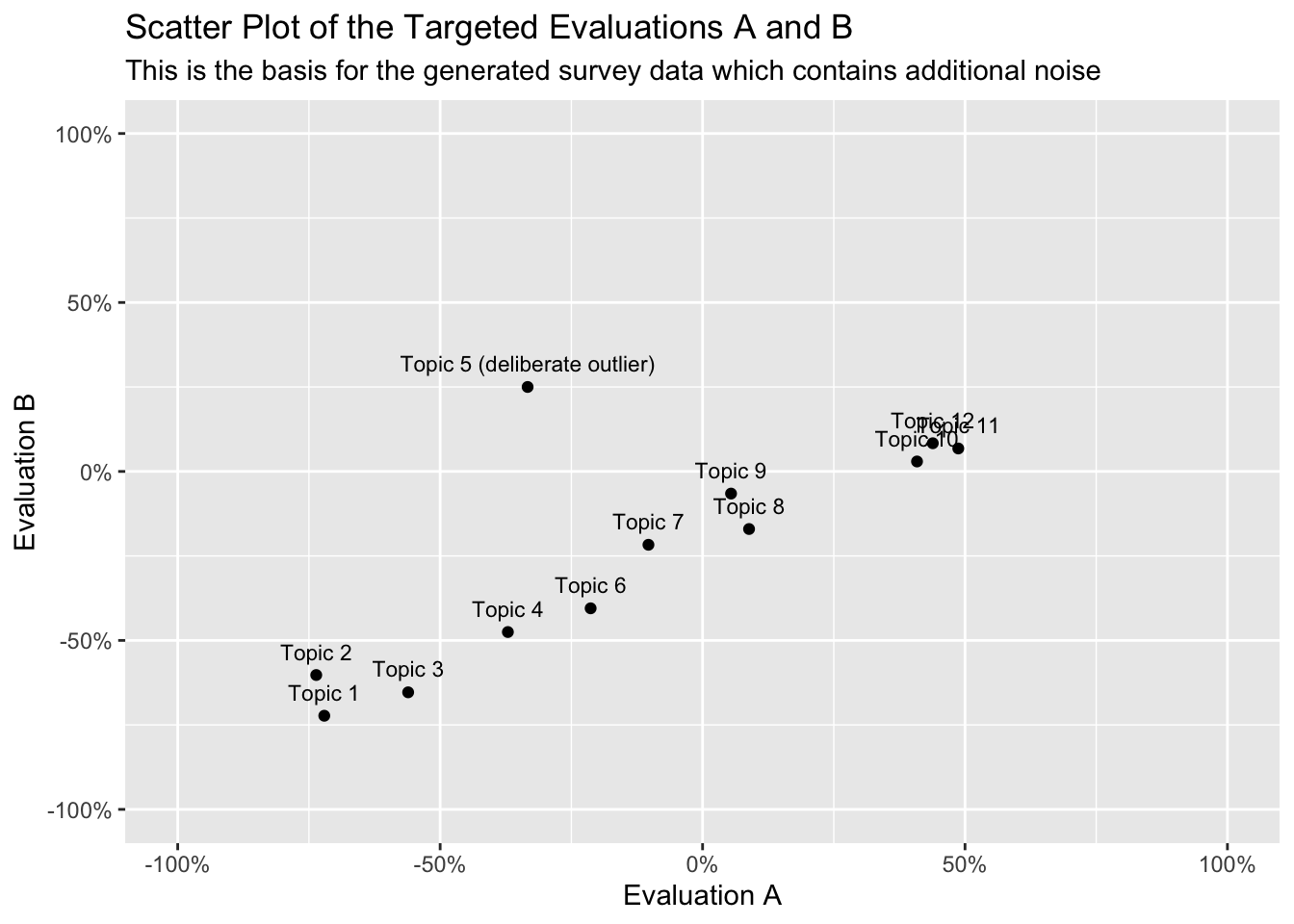 N <-12# number of topics to simulateTOPICS <-read.csv2("matrixlabels.csv") # Generate mean evaluations A and B, inversly correlated and with some noise, and an interceptevaluationA <-seq(-0.75, 0.50, length.out = N)evaluationB <-seq(-0.75, 0.10, length.out = N)# Add some random noisefor (i in1:N) { evaluationA[i] <- evaluationA[i] +rnorm(1, mean=0, sd=0.05) evaluationB[i] <- evaluationB[i] -rnorm(1, mean=0, sd=0.05) }# Purposefully defined outlierevaluationA[5] <--1/3evaluationB[5] <-+1/4combinedMeans =c(evaluationA, evaluationB)